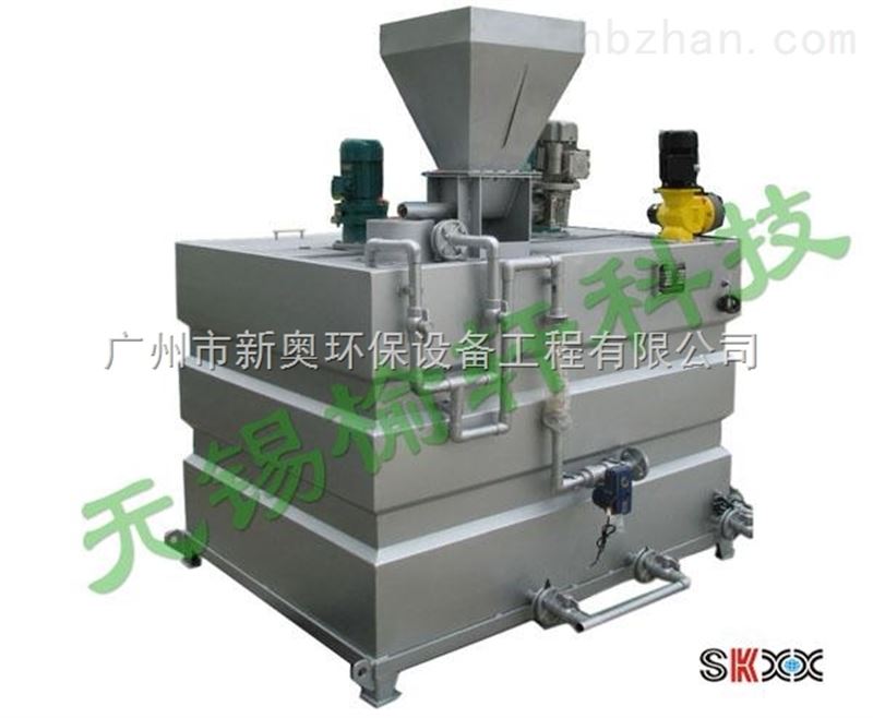 PAM自动加药装置由三腔式箱体、干粉投加系统、溶解系统、熟化系统、储药系统、控制系统、液体投加系统构成。本装置是粉状高分子凝絮剂的自动连续配置及投加系统。干粉絮凝剂从螺旋推进器内进入速溶器内与清水进行预混,被湿润的物料进入配制槽进行搅拌稀释,按要求浓度进行配制;若为液态絮凝剂则由螺杆泵直接投加到配制槽中。配制过程中,进水量在流量计观测下必须相对稳定,从而保证在整个工作过程中,配制溶液浓度不变。具有误差小,调节方便等优点。设备全采用PLC控制,设有手动、自动两种工作方式。