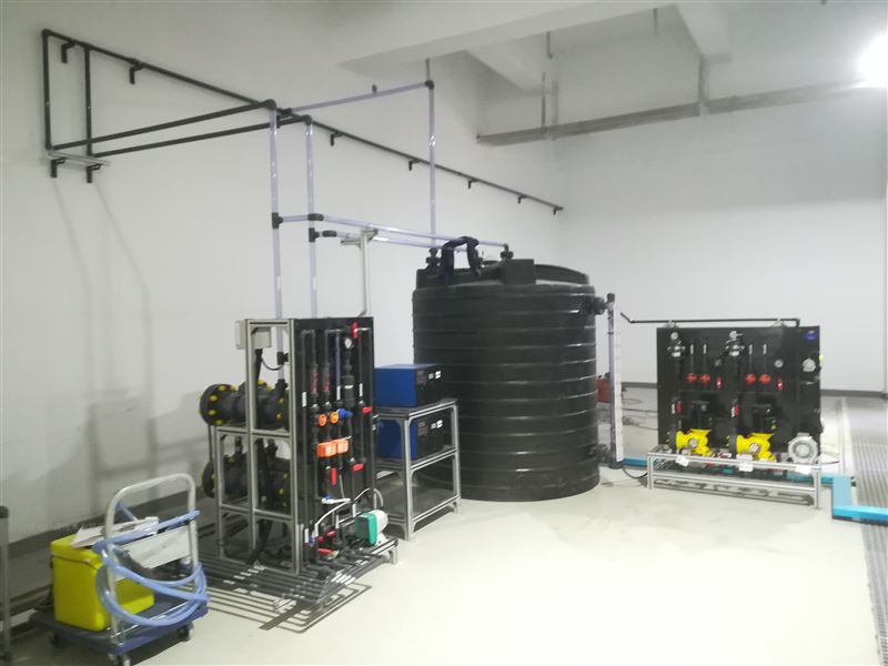 酸洗系统:电解槽在使用一段时间后,电极表面会结垢,需要定期用酸洗系统进行清洗,从而保证电极的电解效率和寿命,我司的酸洗系统设置为全自动清洗系统,可以设定清洗周期,定时清洗,保证设备的运行稳定;